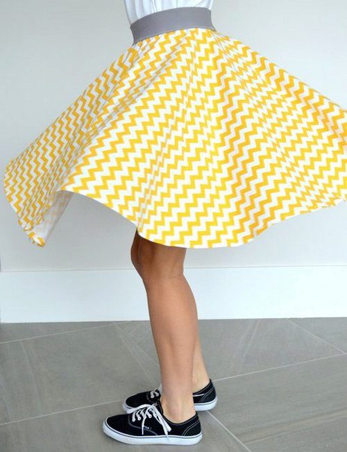 Такие юбки как “солнце” и “полу-солнце” шьются очень просто. Выкраивать юбку можно сразу же на ткани. Лучше всего выбирать не плотные ткани, а достаточно легкие, струящиеся. Если юбка-солнце короткая, то ее можно выкроить и вовсе без швов, как это сделать, смотрите ниже.