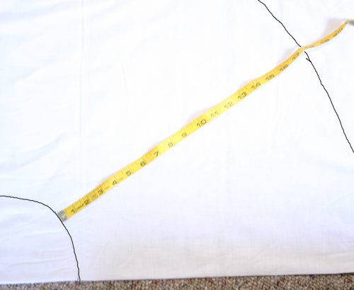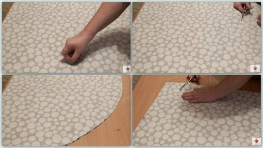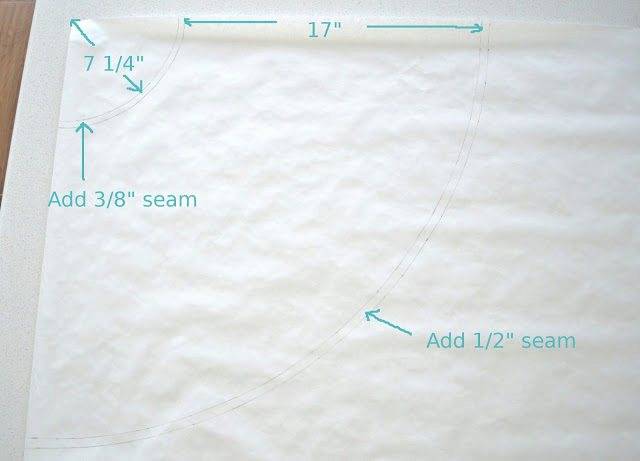 Теперь от угла в круговую откладываем первый радиус 12 см. Мелком очерчиваем, булавочками по бокам фиксируем, чтобы ткань не съехала.