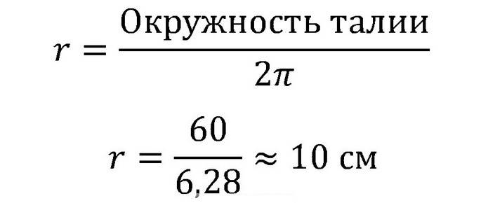 - Важным пунктом является расчет радиуса круга. Радиус вычисляется по формуле из курса школьной программы по геометрии. Обхват талии вместе с припуском нужно разделить на удвоенное число пи.