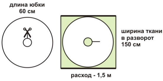 Если немного округлить, то получится 1,5 м ткани потребуется для юбки-солнца.