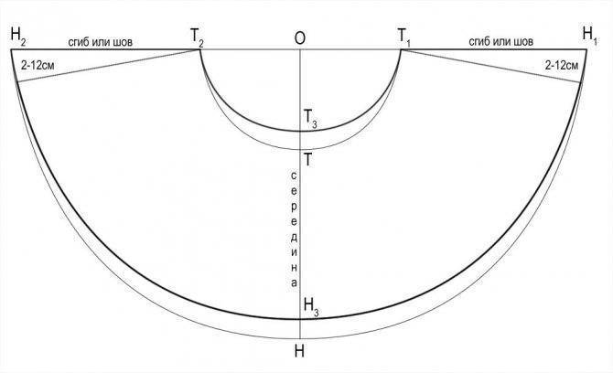 - По точкам пересечения малого радиуса с линиями (А1 и А2) установите длину юбки. Полученные точки обычно обозначаются как H1 и H2.