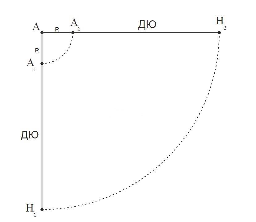 - По точкам пересечения малого радиуса с линиями (А1 и А2) установите длину юбки. Полученные точки обычно обозначаются как H1 и H2.