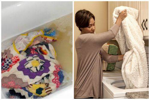 Возьмите объемное покрывало и уложите его в ванную так, чтобы оно «утонуло» полностью. Можете засечь время. Ждите около 3 часов. При этом каждые 30 минут полоскайте изделие, аккуратно сминайте его руками, но не растирайте