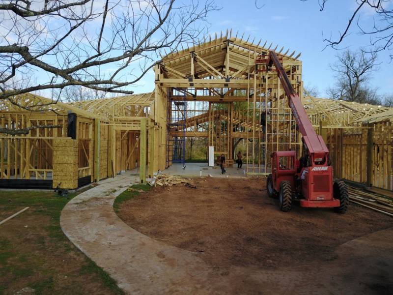 После этого каркас дома приобретает свои очертания и стабильность, поэтому можно смело снимать временные диагональные опоры, так как они уже выполнили свою задачу.