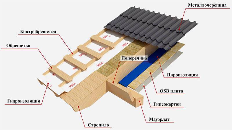 Поэтапно монтаж лаг, стропил и кровельного пирога выглядит так: