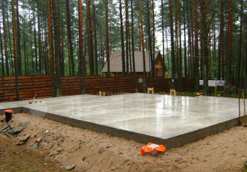 Особенностью такого основания является то, что он двигается при сезонных расширениях грунта. По этой причине его иногда называют «плавающим». Для его обустройства необходимо заглубиться по периметру на 100-200 мм, а вокруг смонтировать опалубку высотой 200-300 мм. В углубление засыпается гравий или песок, трамбуется, после чего внутри связывается каркас из арматуры и заливается бетон. В раствор желательно добавлять влагостойкие добавки, которые обеспечат долговечность плиты и сухость полов в доме.