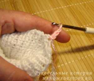 Провязываем 5 рядов. В 6 ряду начинаем делать отверстия, т.к. пинетки будем декорировать атласной лентой (если предпочитаете пинетки без завязок, пропускаем этот пункт), для этого провязываем 3 петли, затем 2 петли вместе и следом делаем накид и так чередуем до конца ряда.