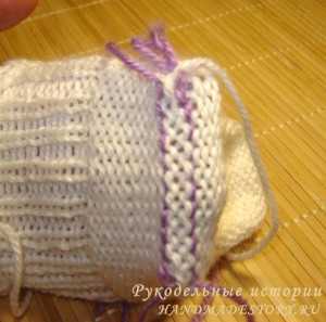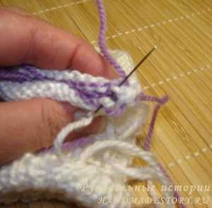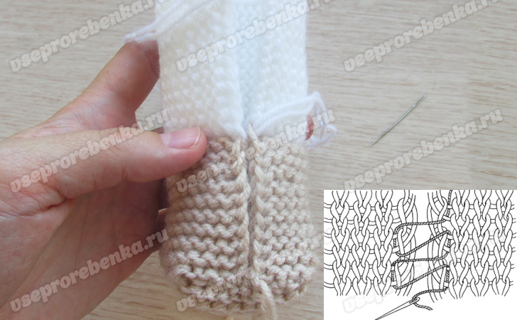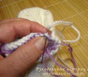 Теперь соединим петли оставшимся кончиком нити. Выворачиваем пинетку на изнаночную сторону, берем иголку с большим ушком, вдеваем оставленную основную нить и собираем петли следующим образом.