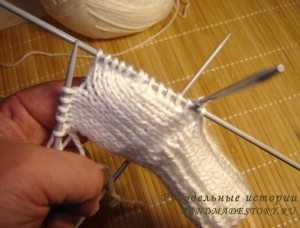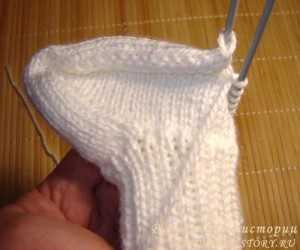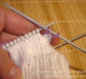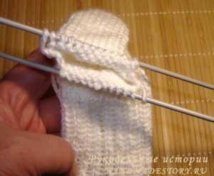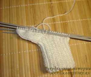 30 ряд: вяжем лицевыми петлями. По одному краю носочка набираем 6 петель.