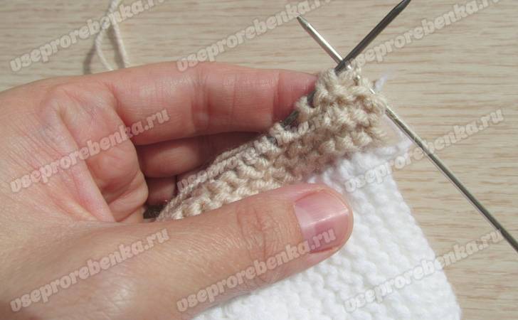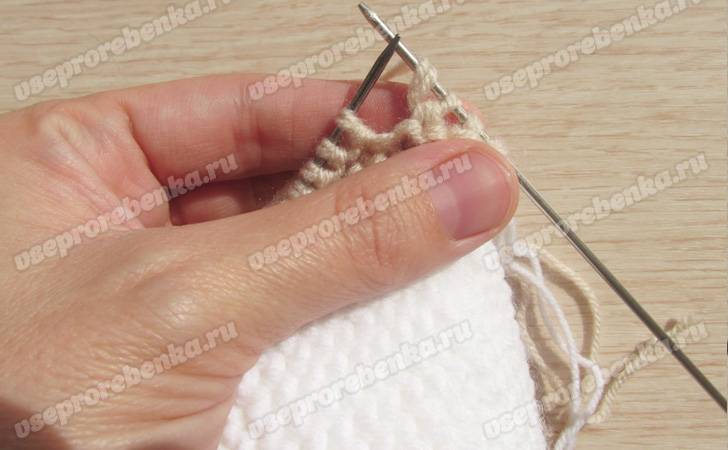 Далее берем бежевую нить и по одному краю набираем 30 петель. Это лицевая сторона: