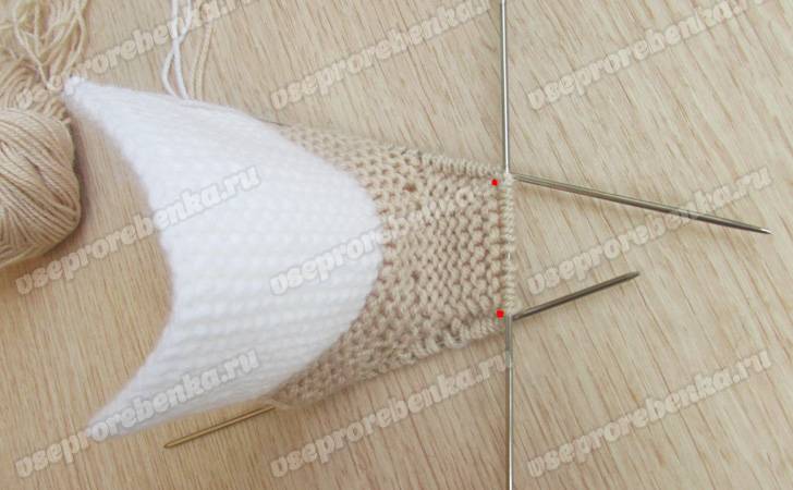 33 петли делим на 3 части. Получается, по 11 петель. Для носочка нужно провязать только 11 петель посередине.