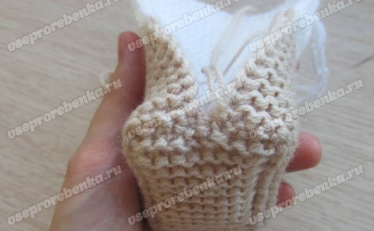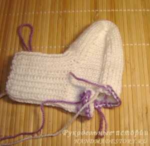 Выворачиваем пинетку и сшиваем. Затем выворачиваем на лицевую сторону. Если вяжите по отдельности каждую пинетку, то свяжите по такой же схеме вторую.