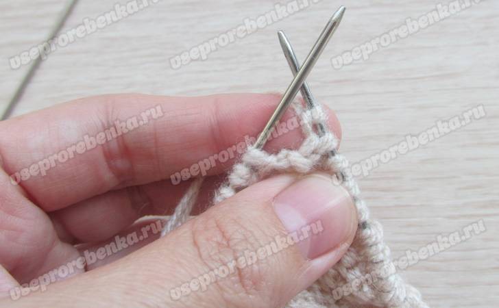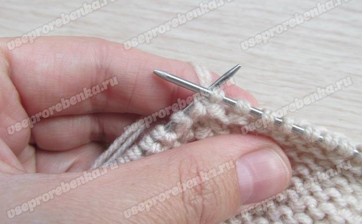- Теперь нужно провязать ряд, чтобы получились дырочки для шнурка: кромка, 2 пет. вместе лицевой, накид и продолжайте так до конца ряда.