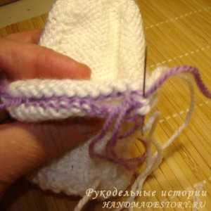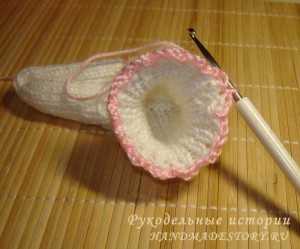 Осталось украсить наше изделие. Если пинетки для девочки, украсим край рюшей,