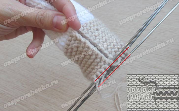 Провязываем еще 3 ряда = всего 9 рядов после манжета. Делим работу на три части.