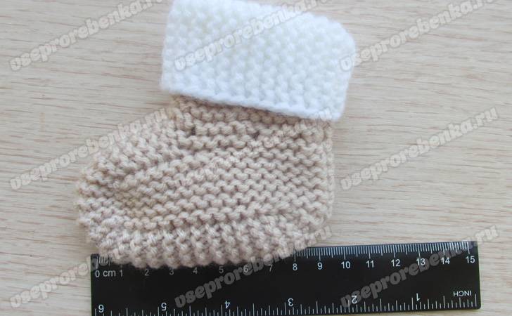 Вязать на средних 12 петлях 14 рядов лицевой гладью. От этой величины зависит размер пинетки. 14 рядов — это самый маленький размер, если нужны пинеточки побольше, вяжем 16 или 18 рядов.