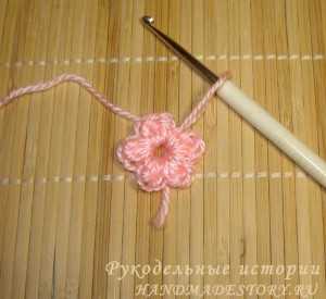 Вяжем листочки для клубничек: набираем цепочку из 7 петель, 3 столбика с накидом, 1 лицевая петля, 3 столбика с накидом, 1 лицевая петля, 3 столбика с накидом, 1 лицевая петля. Веточка вяжется из 4 петель.