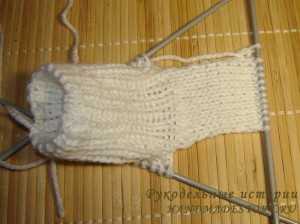 Верх пинетки, манжет, будем вязать резинкой 1*1 (36 петель). Для этого на первую пару спиц набираем 18 петель и на вторую 18 петель.