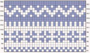 19-20 ряд: 1 кромочная петля, 1 изнаночная петля, 1 лицевая петля и так далее.