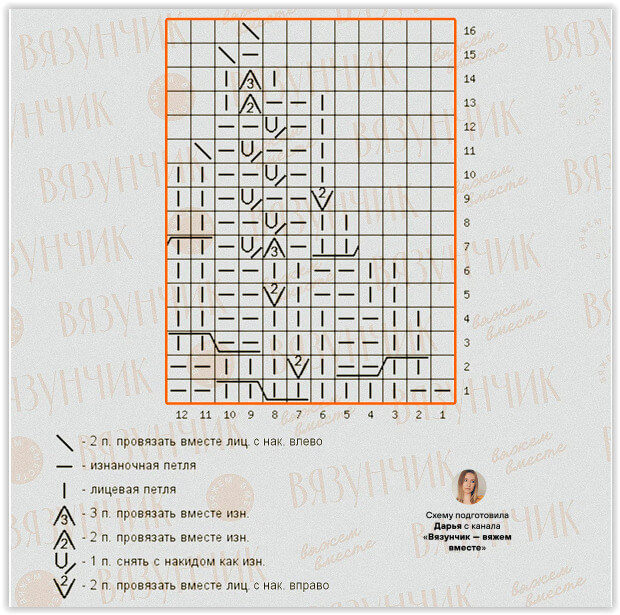 Как делать убавки. Убавки получаются за счет убавления пет. в середине раппорта. 1-й р. убавлений: МК, *2 изн, 4 лиц, (ПКР) влево 2 лиц/2 лиц, 2 изн* – повтор 7 раз. 2-й: МК, *ПКР) вправо 2 лиц/2 изн, 1 изн, 2 вместе лиц. с наклоном вправо, 3 лиц, 2 изн.* – повторить 7 раз