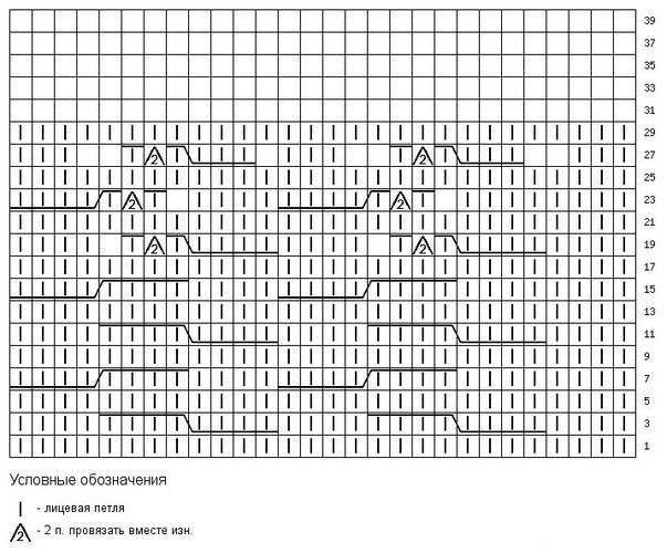 28-й ряд: 2 лиц., 2 вместе, 2 лиц., 2 вместе, и так далее до конца ряда. 29-й и 30-й – лицевой и изнаночный ряды. 31-й: 2 лиц., 2 вместе, 2 лиц., 2 вместе, и так дальше. (осталось 65 п.) 32-й и 33-й – лицевой и изнаночн. ряды. 34-й – как 31-й. 35-й и 36-й – лиц. и изн.