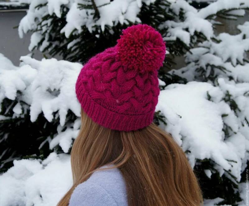 Вот и все! Ваша шапка с узором «косы» и мелким бубоном на вершине готова!