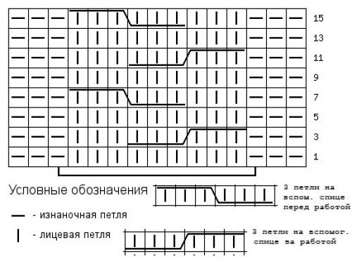 *1 изнаночную перекидываем на дополнительную спицу за работой, 2 лицевые, 1 изнаночная с дополнительной спицы, 2 лицевые перекидываем на дополнительную спицу перед работой, 1 изнаночная, 2 лицевые, 2 изнаночные*.
