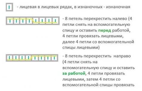 Перекрещивание (ПКР) вправо 2 лиц/2 лиц: 2 пет. снять на вспомогательную спицу и оставить за работой, вязать 2 лиц, затем 2 лиц. со вспомогательной спицы. Перекрещ. (ПКР) влево 2 лиц/2 лиц: 2 пет. снять на вспомогат. спицу и оставить перед работой, вязать 2 лиц, затем 2 лиц. со вспомогательной спицы. Перекрещ. (ПКР) вправо 2 лиц/2 изн: 2 лиц. снять на вспомогательную спицу и оставить за работой, 2 изн., затем 2 лиц. со вспомогат. спицы. Перекрещ. (ПКР) влево 2 изн/2 лиц: 2 пет. снять на вспомогат. спицу и оставить перед работой, 2 лиц., затем 2 изн. со вспомогат. спицы.