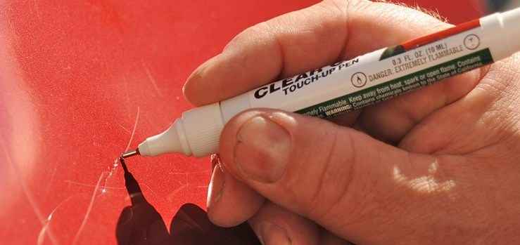 Сначала участок тщательно чистят и обрабатывают обезжиривателем. После этого берут кисточку из флакона, и наносят внутрь царапины краску. Чтобы не закапать вокруг, пользуются малярной лентой.