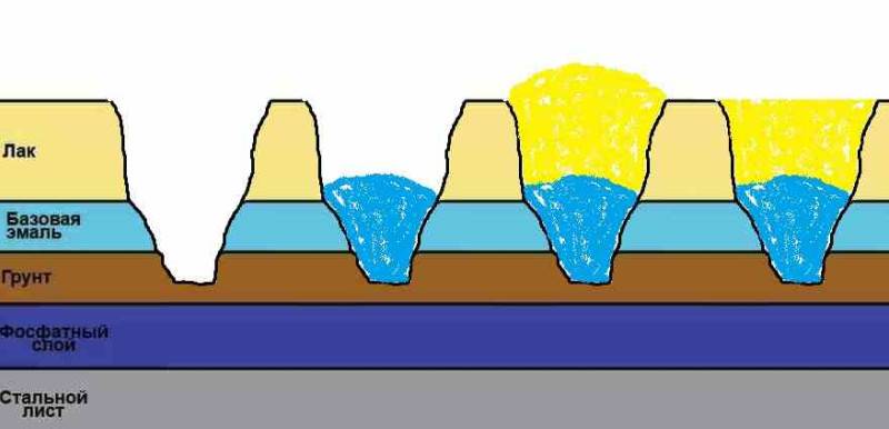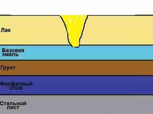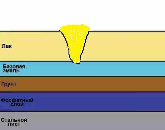 Технология ничем не отличается от описанного выше подкрашивания трещины на лаке. Только тут придется подкрасить еще и слой базовой эмали.