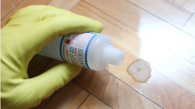 - Обработать химическими растворителями. Они обильно наносятся на загрязнение, затем поверхность обрабатывается моющим средством и вытирается насухо.