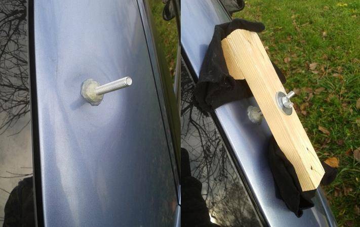 Место работы обезжиривается (как и шляпка болта), после чего в дело идет клеевой пистолет. Приклеив болт, добавьте клея еще и сверху, для надежности. Резьба поможет закрепить подобие рукояти или ушка. За них болт тянется всем, что есть подручного. Но делать это надо аккуратно, в несколько приемов, постоянно контролируя процесс. Болт может и оторваться. Снимаете растворителем клей и повторяете процесс до тех пор, пока вмятина не выправится.