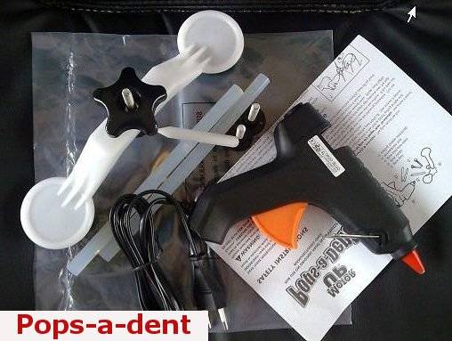 Также к списку необходимых инструментов относят набор для выравнивания дефектов Pops a Dent. В него входят насадки, скоба из пластика, клей. Ремонт выполняют следующим образом: