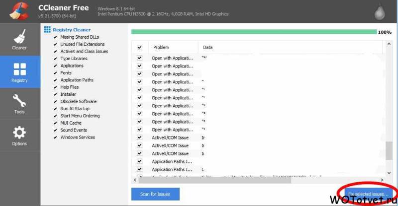 Плюсы этой программулины в том, что не надо рыскать вручную по реестру и исправлять «косяки» за системой, данная программа сделает все за Вас (и найдет еще тучу ошибок).