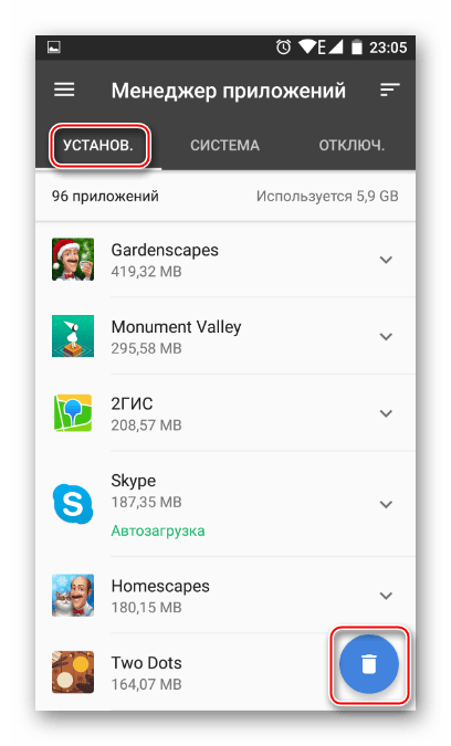 Откроется список установленных приложений. Нажмите на иконку корзины.