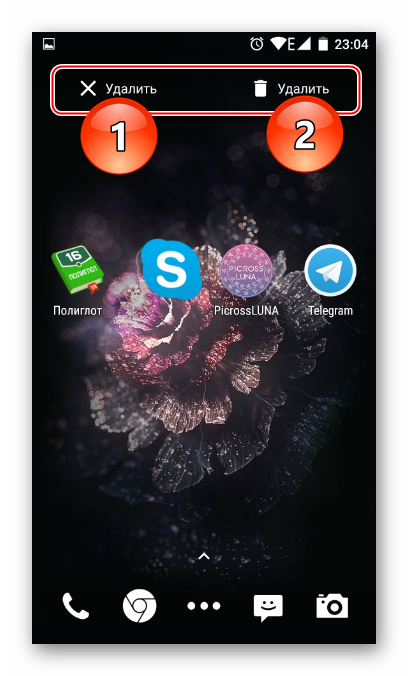 На скриншоте ниже видно, что Android 7 предлагает удалить иконку приложения с экрана (1) либо удалить приложение из системы (2). Перетяните иконку к варианту 2.