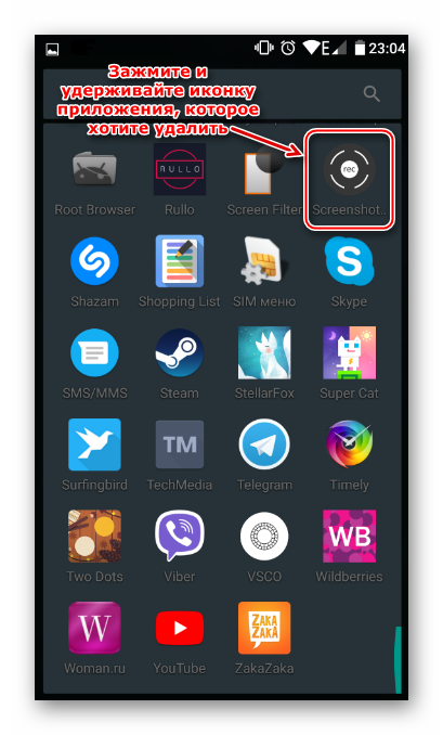 - Найдите ярлык приложения, которое хотите удалить. Оно может быть как в меню, так и на домашнем экране. Нажмите иконку и удерживайте ее до тех пор, пока на домашнем экране не появятся дополнительные действия, которые можно произвести с этим приложением.