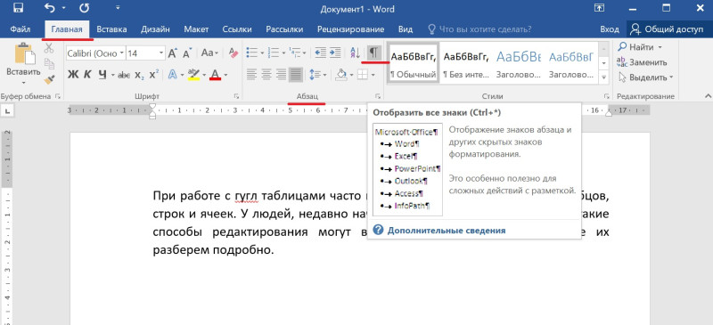 - Нажмите соответствующий значок («¶»)на верхней панели (вкладка «Главная») или используйте комбинацию клавиш «Ctrl+Shift+8».