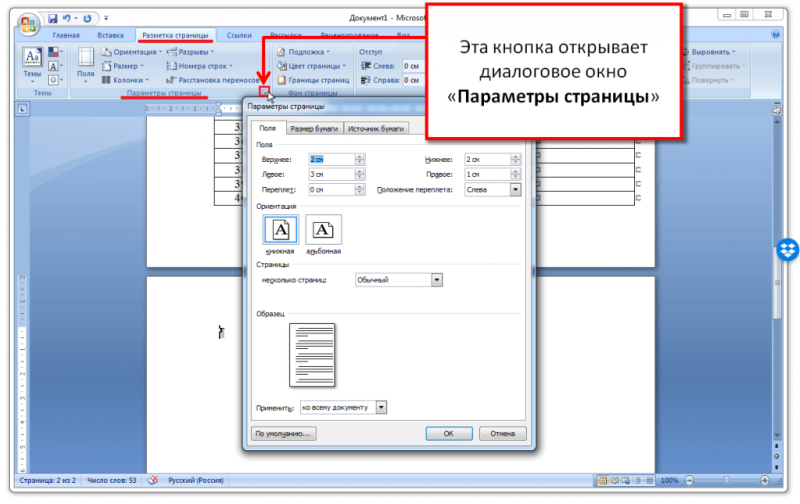Что нужно сделать: переходим во вкладку «Разметка страницы» и в меню «Параметры страницы» в самом низу справа видим малюсенькую кнопочку с таким рисунком . Эта кнопочка открывает диалоговое окно «Параметры страницы»: