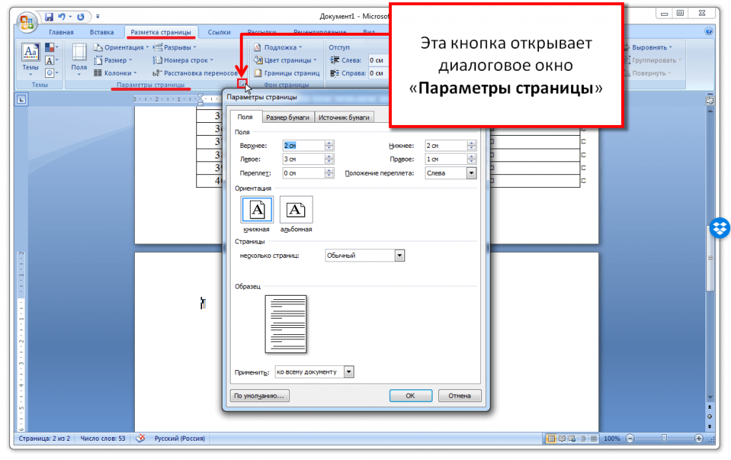 Что нужно сделать: переходим во вкладку «Разметка страницы» и в меню «Параметры страницы» в самом низу справа видим малюсенькую кнопочку с таким рисунком . Эта кнопочка открывает диалоговое окно «Параметры страницы»:
