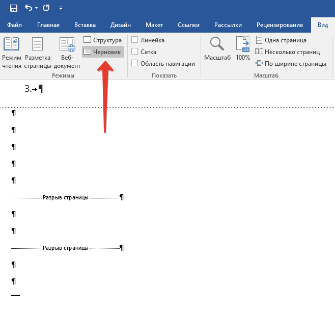 - Отобразятся скрытые элементы форматирования – это могут быть как разрывы листков, так и значки абзацев «¶».