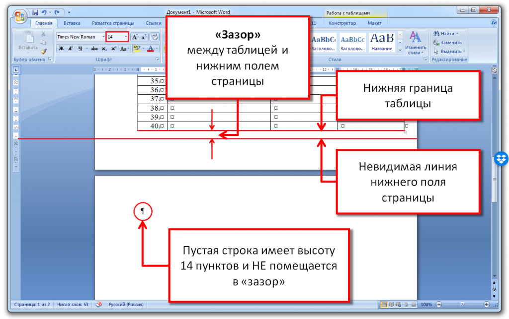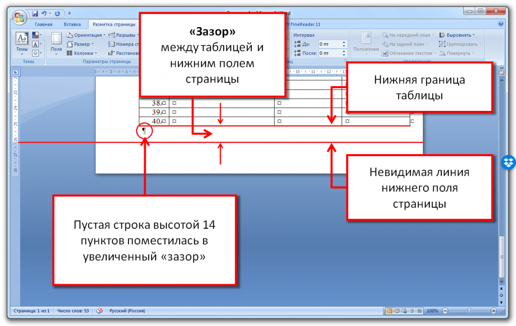 Вышеописанные методы удаления пустой страницы окажутся бездейственными, если в конце вашего текстового документа расположена таблица — она находится на предыдущей (предпоследней по факту) странице и доходит до самого ее конца. Дело в том, что в Ворде обязательно указывается пустой абзац после таблицы. Если же таблица упирается в конец страницы, абзац перемещается на следующую.