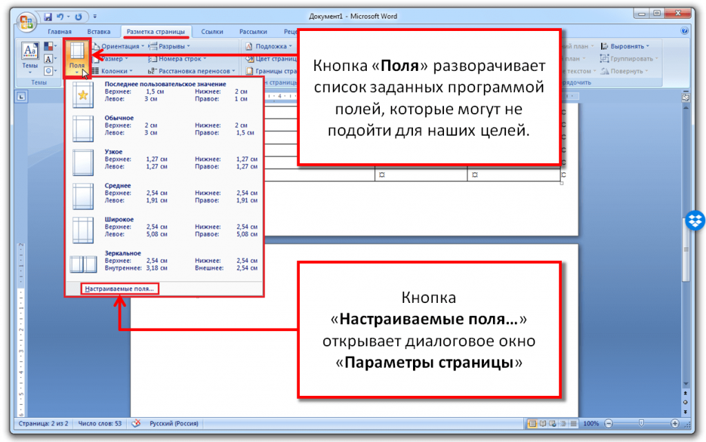 Конечно, можно в меню «Параметры страницы» выбрать пункт «Поля». Но в списке, открываемом по этому пункту, стоят «жёсткие» значения полей. Они чаще всего не подходят для нашей задачи.