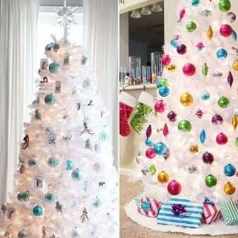 В этом случае стоит оформить белую ель яркими разноцветными фигурками в виде варежек, новогодних подарков, домиков, героев мультфильмов и снежинок. Домашние венки выглядят интересно. Для их создания берут декоративные веревки, закрепляют на них различные украшения на определенном расстоянии и обматывают ветви по кругу получившимся изделием.