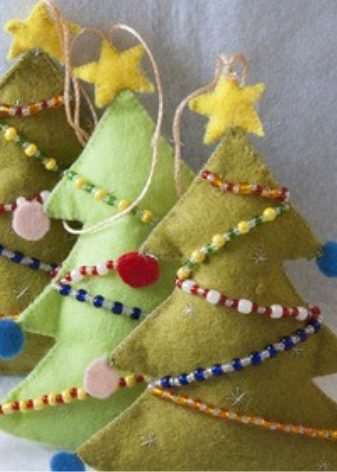 Другой вариант — украшение в виде тканого полотна в форме маленькой зеленой елочки. Для этого чаще всего используется войлок, из которого вырезаются заготовки соответствующей формы. Они пришиты друг к другу внутри каждого такого изделия. При необходимости можно ввести небольшое количество наполнителя, чтобы детали выглядели более объемными. Общую композицию можно красиво дополнить несколькими большими красными или золотыми бантами.