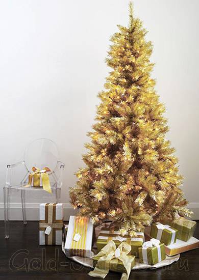 Большинство золотистых ёлок имеет окрас с уклоном не в рыжий, а в чуть зеленоватый цвет, благодаря чему они не выглядят как что-то из ряда вон выходящее. Спектр цветов украшений для этих елей практически не ограничен, но, сами понимаете – придется соблюдать меру, дабы не превратить новогоднюю ёлку в китч.