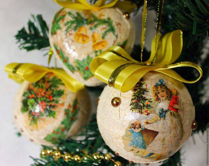 одинакового размера и оттенка (золотые, серебряные), банты в тон шарам, картонные фигурки, стеклянные колокольчики