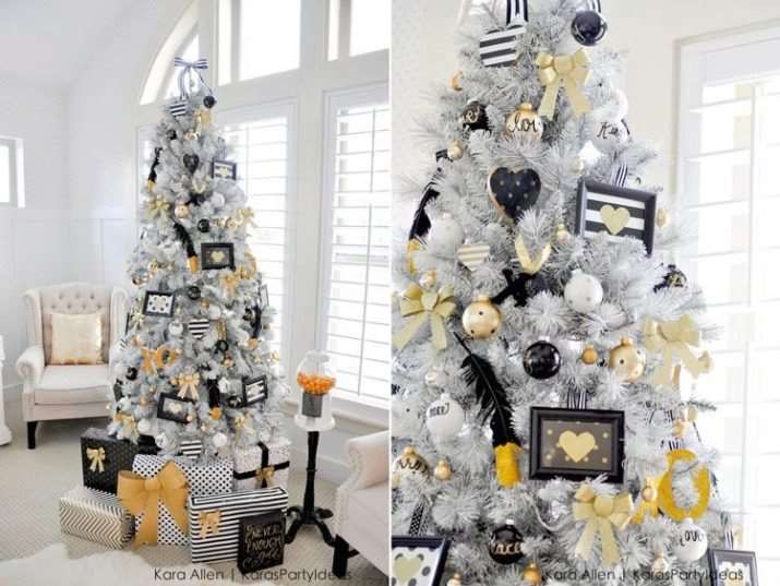 Интересный вариант — костюм, состоящий из фотокаркасов. Они просто закрепляются смешанным отическим способом со всех сторон дерева. Такие изделия, выполненные в черном и золотом цветах, прекрасно смотрятся на белых елках. Иногда на белую красавицу быстро вешают много семейных фотографий в светлых картонных или бумажных рамках.