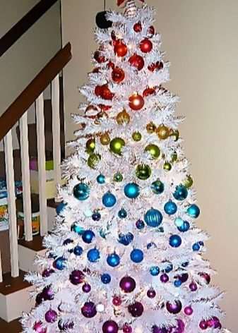 В этом варианте сочетаются игрушки разных форм, размеров и цветов. Часто используются красные, синие, голубые, зеленые, серебряные, золотые, розовые и даже черные изделия. Также рекомендуется выбирать простые детали с украшениями с блестящим матовым покрытием и рельефными узорами.