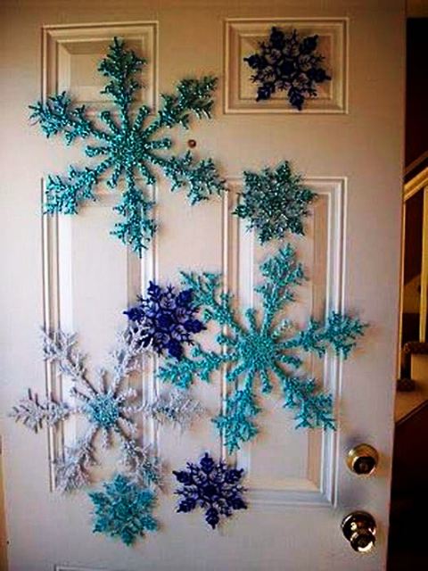 Вы можете изготовить несколько разноцветных снежинок и наклеить эти украшения на поверхность дверного полотна, как внутри, так и снаружи помещения.